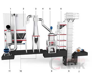 HGM超細磨粉機全套配置包括破碎機、斗式提升機、儲料倉、振動給料機、磨粉設備主機、變頻分級機、雙聯旋風集粉器、脈沖除塵系統、高壓風機、空氣壓縮機、電器控制系統。
